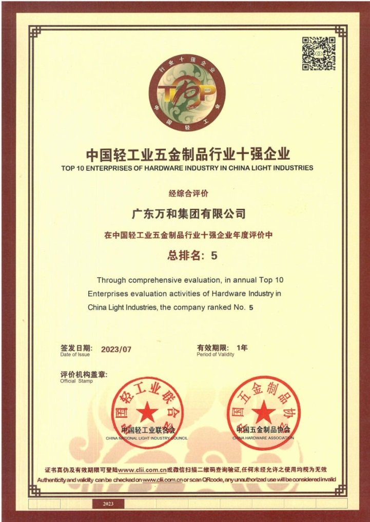 近日,中国轻工业联合会发布中国轻工业行业十强企业统计评价结果公告(2022年度),广东万和集团有限公司入选“中国轻工业五金制品行业十强企业”榜单,总排名位列第五。