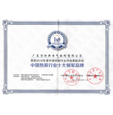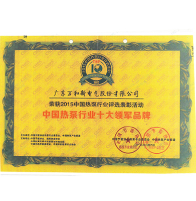 中国热泵行业十大领军品牌证书