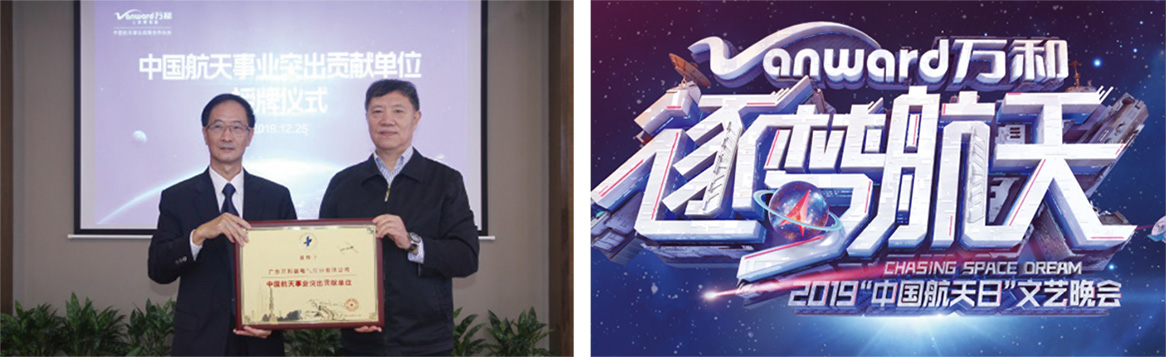 2019年万和成为湖南卫视2019“中国航天日”文艺晚会总冠名商,继续携手中国航天一起砥砺前行。中国航天基金会颁发万和“中国航天事业突出贡献单位“。