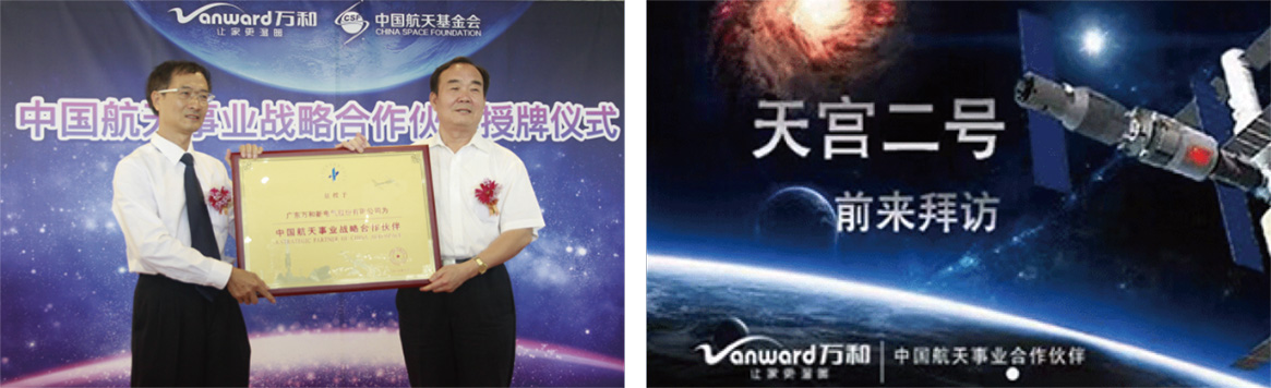 2009年2008年度“中国航天基金奖”颁奖大会上,万和为做出突出贡献的航天科技人员颁奖。2007年“中国航天基金会授予万和“中国航天事业合作伙伴"嫦娥一号”升空--万和冠名赞助“全国校园文化航天科普活动”,捐赠图书15000份。